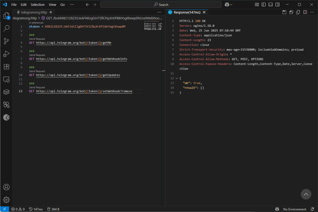 Using VS Code and the amazing “REST Client” extension we can query bots and use it to mitigate criminal action. First, using the “getMe” method I check if the token is active. The 200 return code and the Json in response indicate that the token is active and therefore ready to receive information from clients, including the phishing site itself.