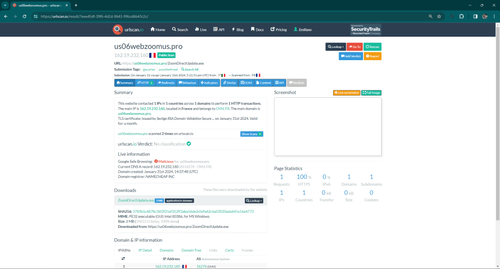 This is a fairly complex attack against Zoom. The attackers registered on Namecheap a domain (us06webzoomus[.]pro) reminiscent of Zoom subdomains and deployed a series of files.