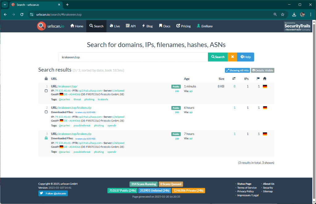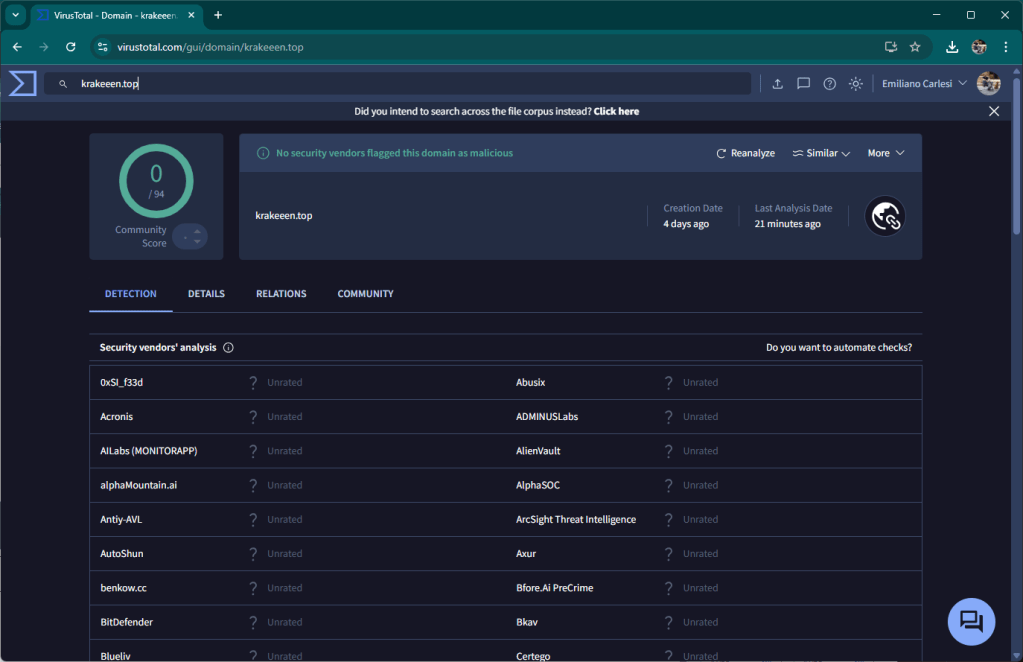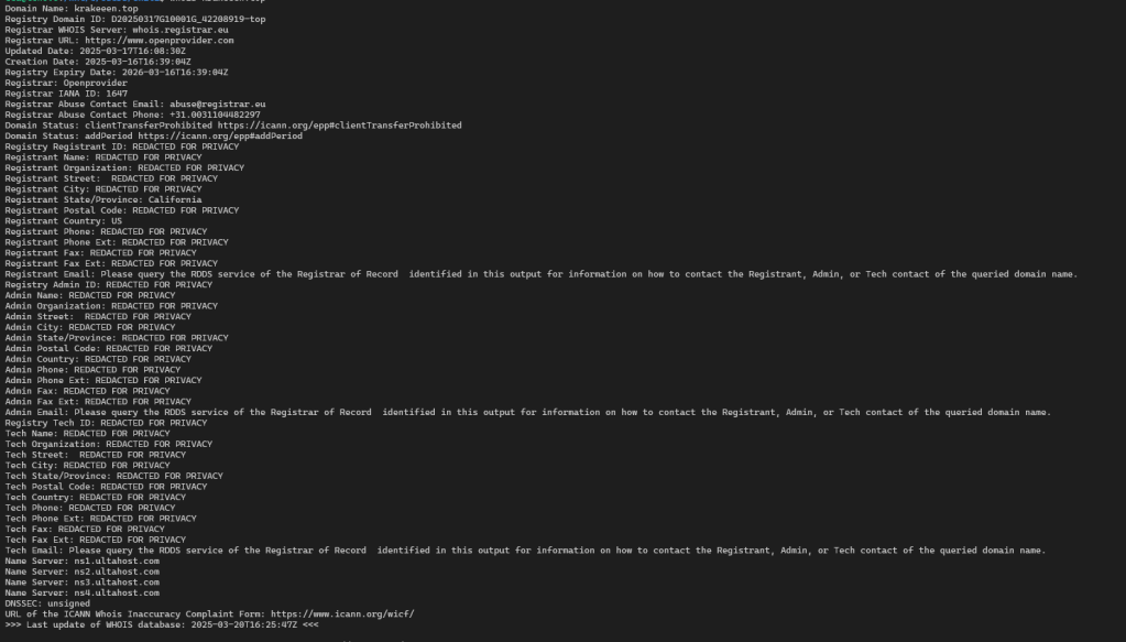The domain used for the attack is krakeeen[.]top. It was registered three days ago and Matrix keep the monitoring active waiting for the kit. It arrives some hours ago. Thanks attacker π