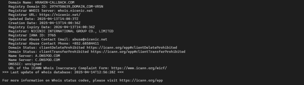 Searching Elastic for domains with “kraken” in their names that are managed by the same DNS server (dnspod.com) brought up several other domains including kraken-centre.com which of course has the kit already online.