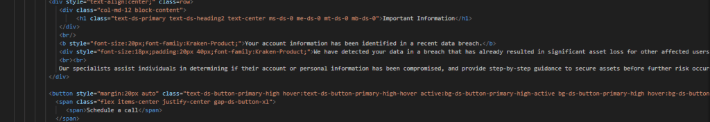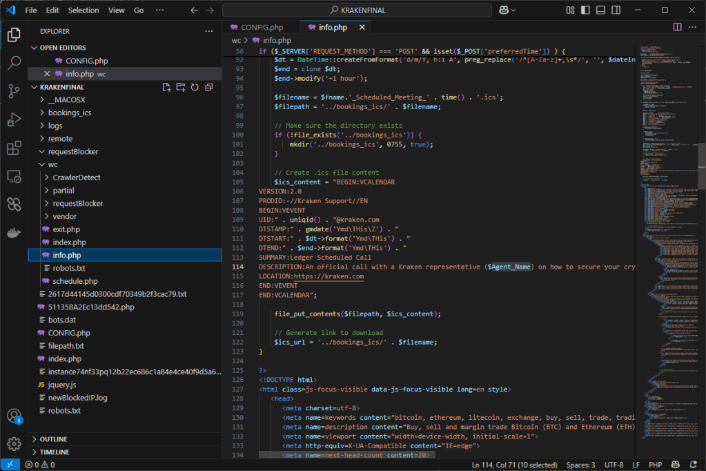 The interesting aspect of this kit is that instead of asking the victim to enter their wallet details, the application suggests the victim to schedule a phone meeting. The user is asked to leave their phone number and is even provided with an .ics file with the appointment details, so that the victim remembers not to make other commitments 😀